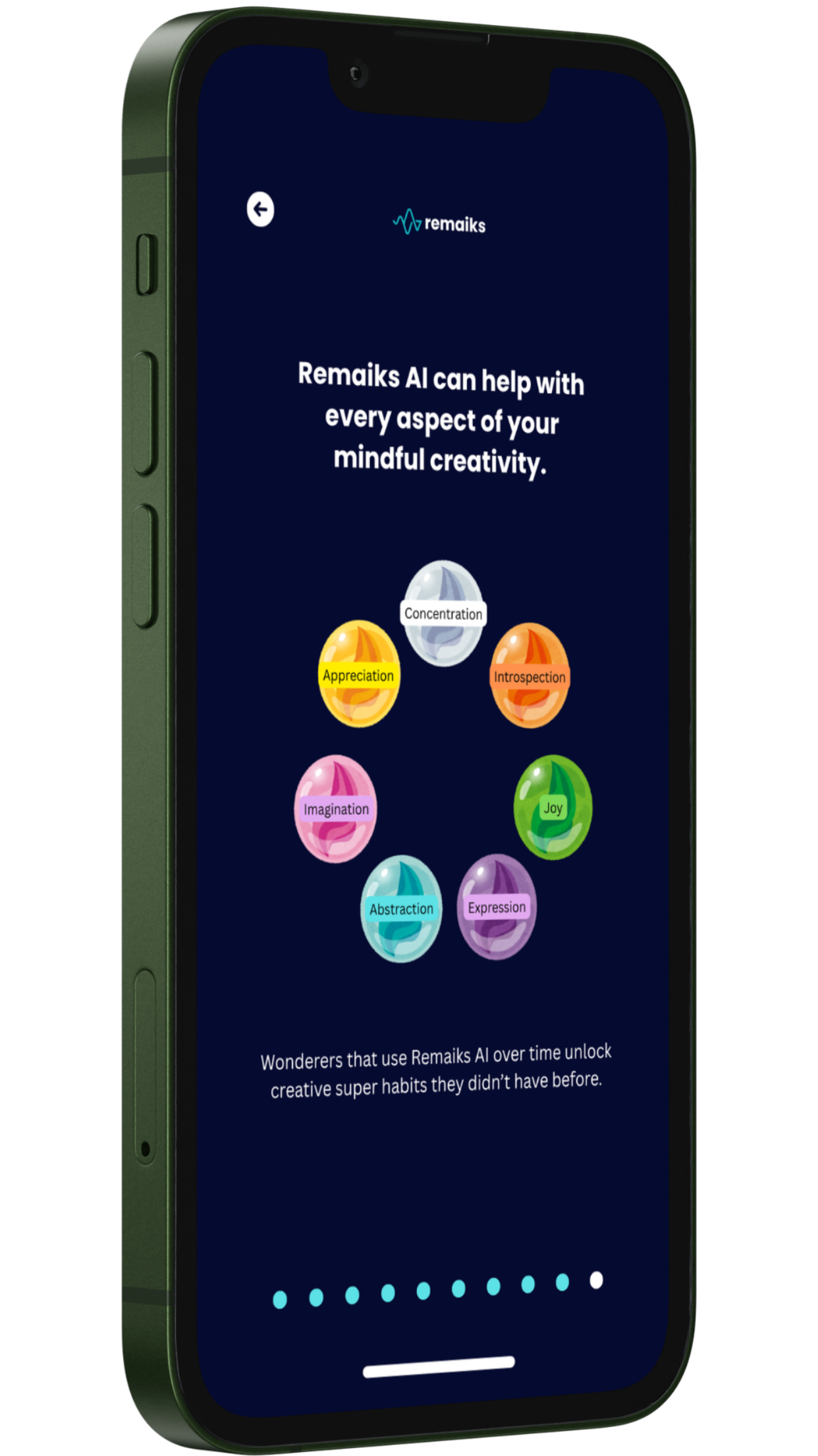 Remaiks AI is pleasurable mental performance and imagination training that improves concentration, abstraction, appreciation, introspection and expression. Your imagination index grows with every artful experience.